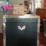 We were able to polish and lacquer the trim on this leather wrapped chest without removing it. The newly polished nickel plated tacks really stand out giving it a great contrast against brass trim.
