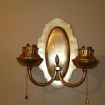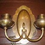 This brass 2-candle wall sconce was restored with new wiring and pull chain sockets. A butler finish preserves the look of it’s age.