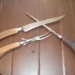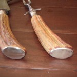 Our silversmith fabricated a missing sterling silver bottom and repaired the other two on thisĀ 100 year old antler carving set.