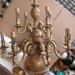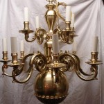 This brass fixture was restored with what we call a “butler” brass finish which gives it that aged appearance. Gold cloth wire was also used – same as on the original and we supplied 7 feet of chain, finished to match.